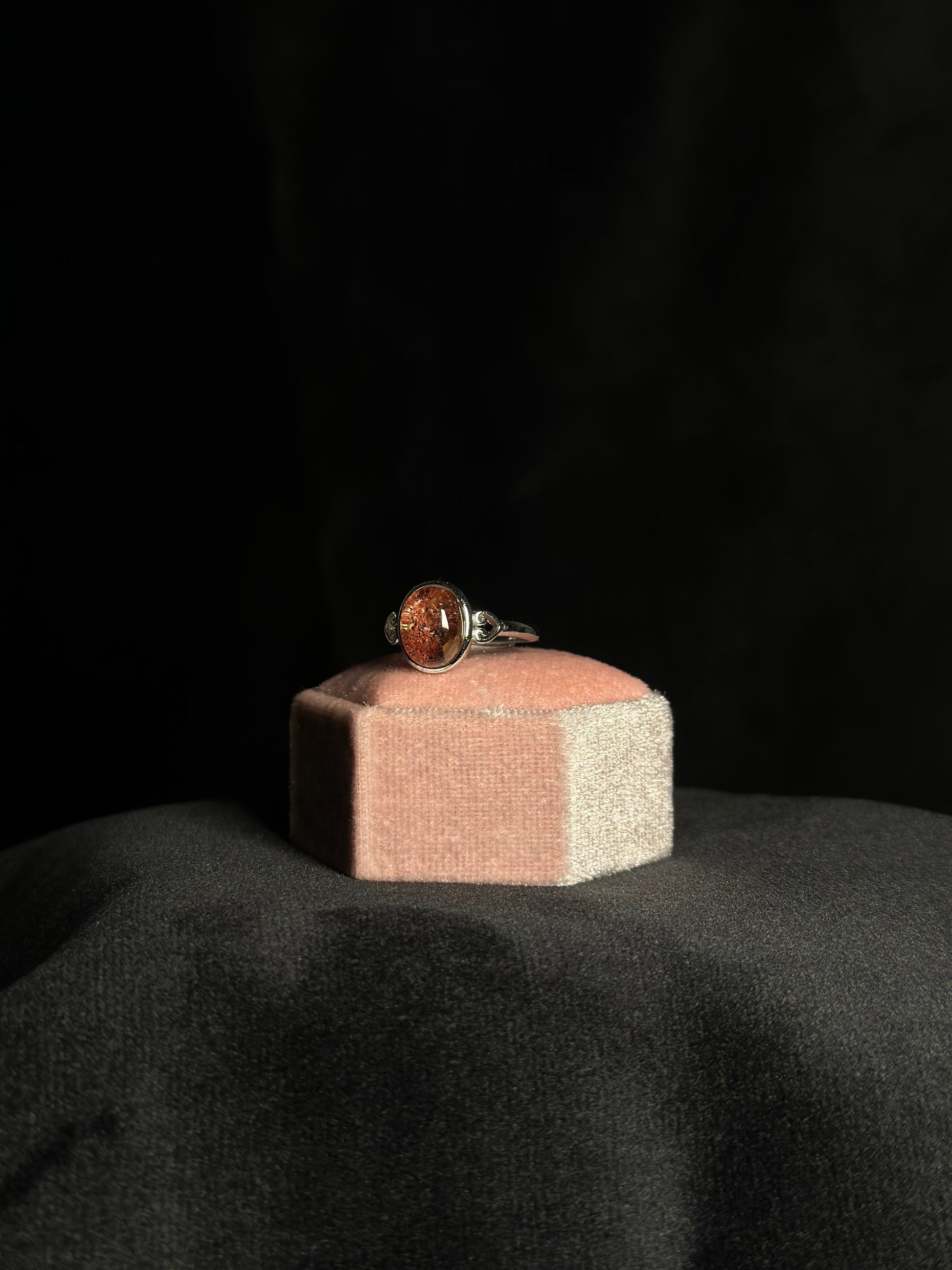 Anello regolabile con montatura in rame placcato argento.