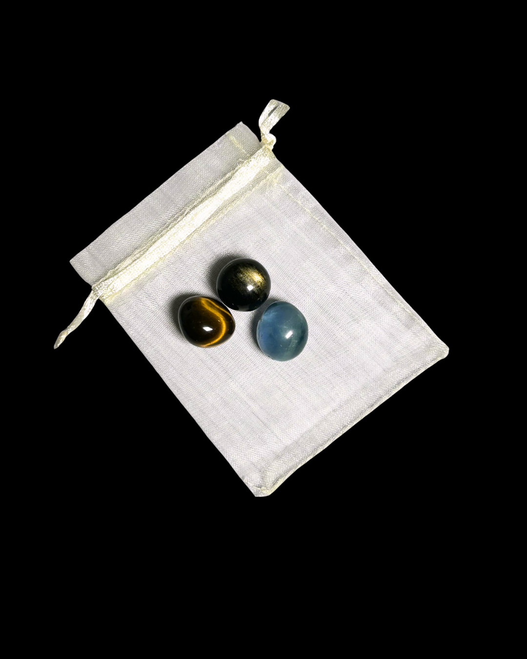 Bellissima accoppiata di Ossidiana nera dorata, fluorite blu e occhio di tigre! Arrivati dentro ad un sacchettino verde, molto utile da portare in borsa o in macchina!