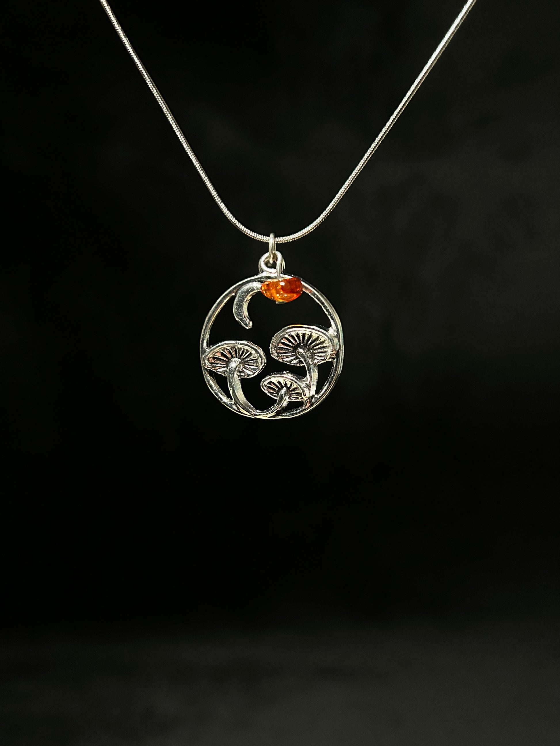 Il ciondolo raffigura tre funghi stilizzati racchiusi in una forma circolare, simbolo di connessione e crescita. La piccola Ambra naturale aggiunge un punto luce caldo e rende ogni pezzo leggermente diverso dall’altro.