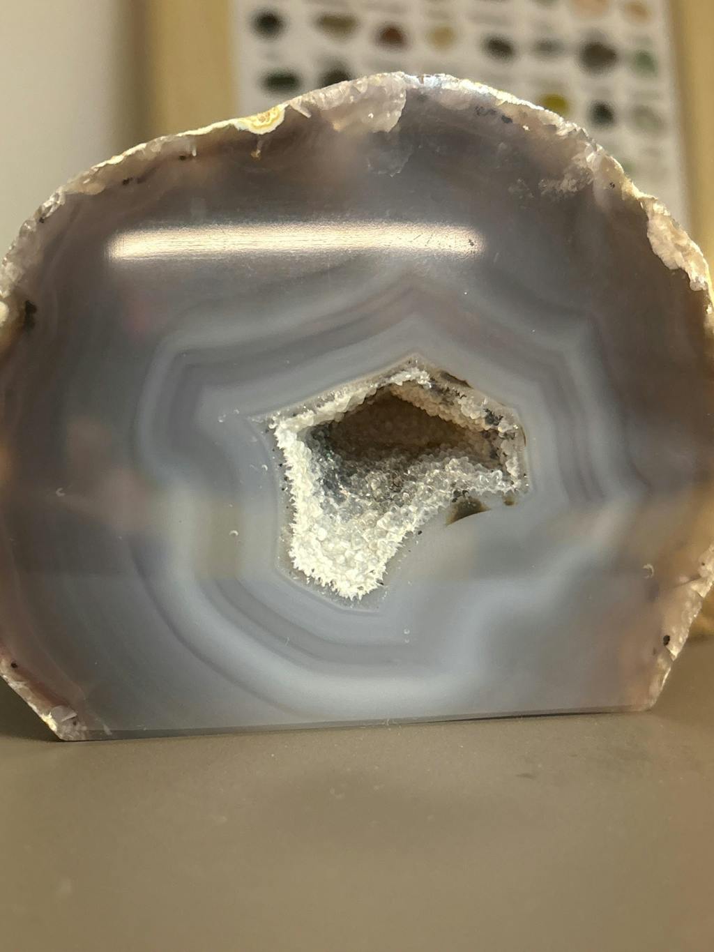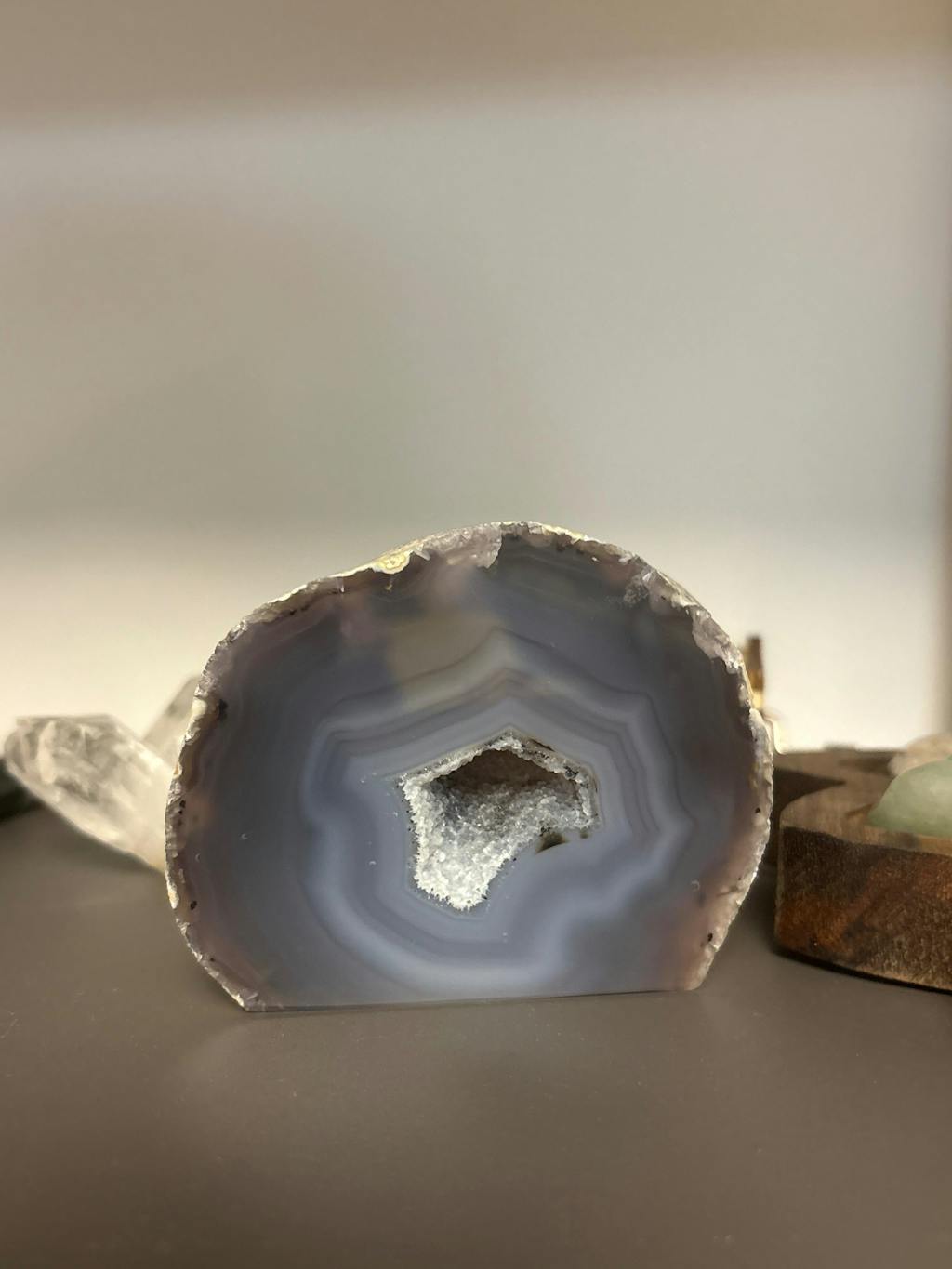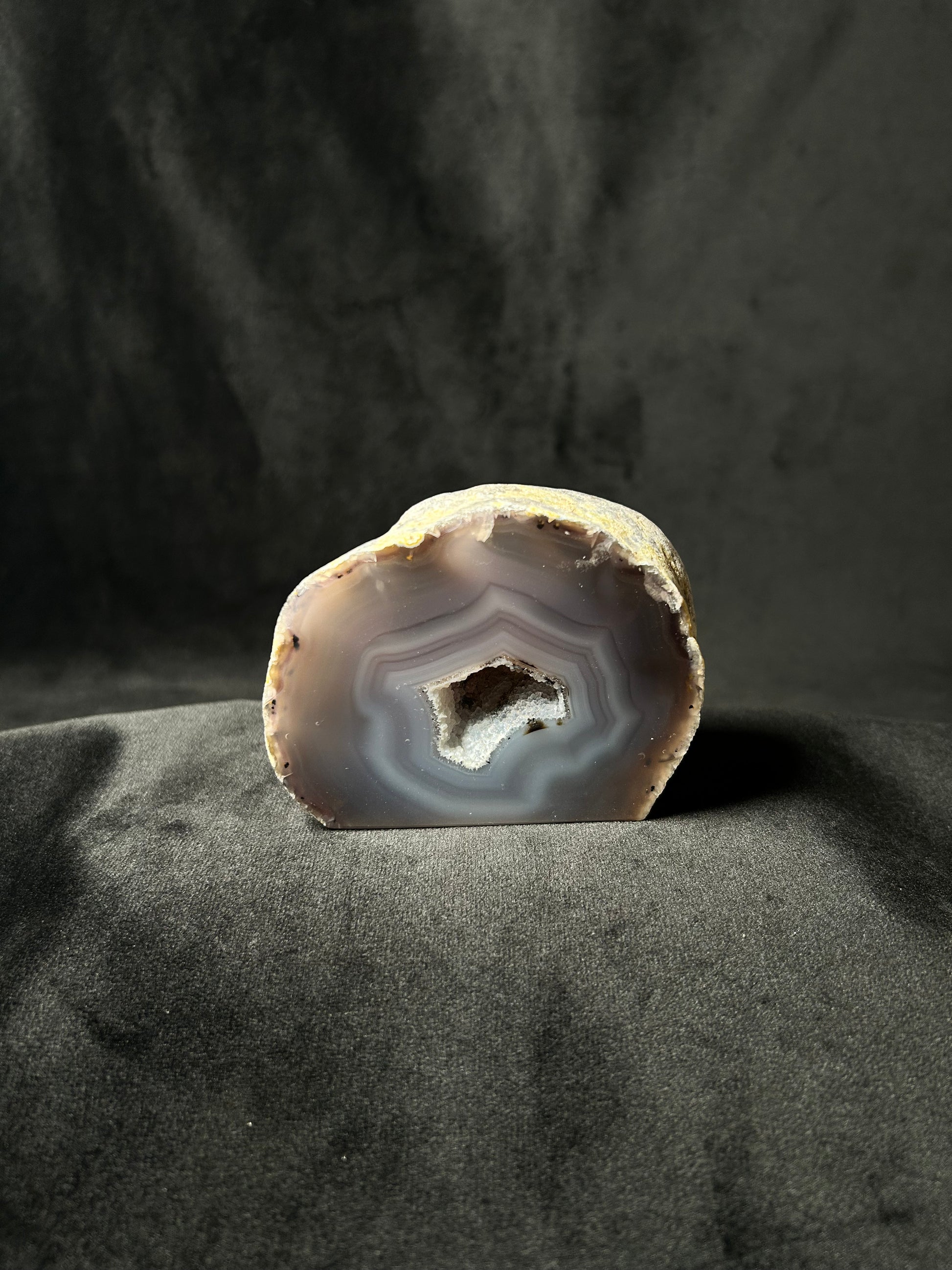 Pezzo unico in agata naturale con drusa di quarzo. Ogni geode è diverso per forma, bande e cavità interna.